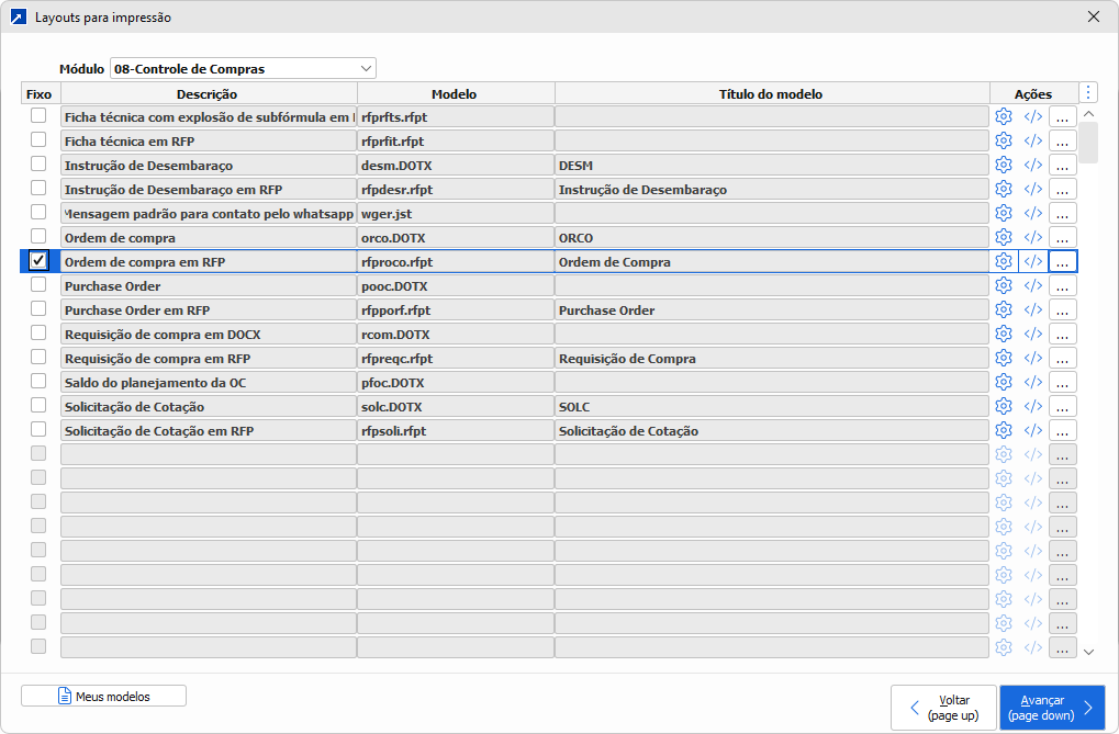 Será exibida janela de "Layouts para impressão" do módulo 08-Controle de Compras.