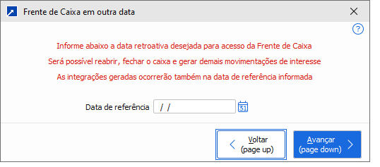 Frente de Caixa em Outra Data Esta rotina possibilita utilizar o frente de caixa em outra data para o ajuste de pendências que tenham ocorrido, mas não foram ajustadas.
