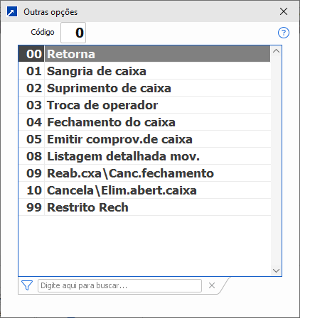 Outras opções do caixa. Sempre será solicitado o operador supervisor para realizar cada uma das rotinas.