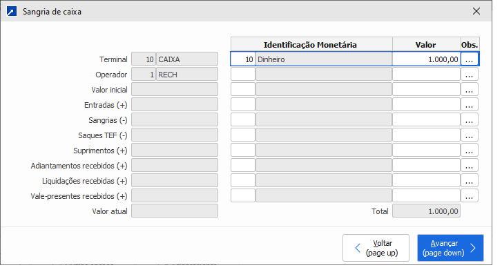 01 Sangria de caixa - Realiza a retira de valores do caixa.