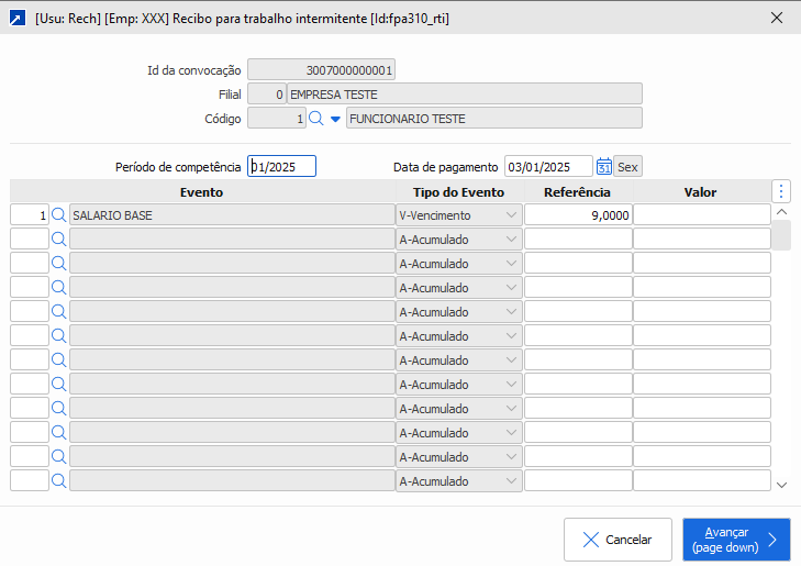 - O recibo intermitente será listado no MENU FPA 3.A-L e será listado junto na folha mensal, MENU FPA 4.1-L e 4.1-T.