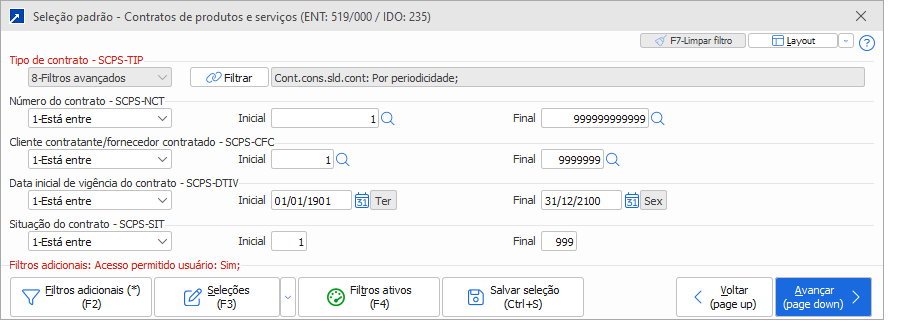 Depois disso, será possível filtrar quais contratos serão exibidos no relatório na Seleção Padrão de Contratos de Produtos e Serviços.