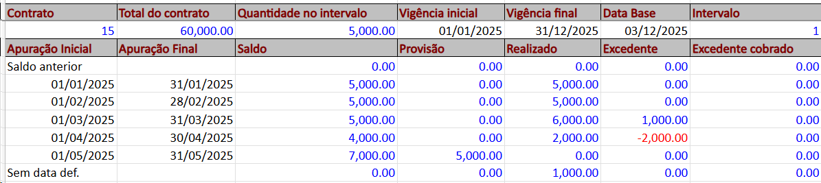 O Contrato 15 possui R$ 60.000,00 contratados para consumo, e o saldo é distribuído em 12 meses, de 01/01/2025 a 31/12/2025. Como o período de apuração é mensal (1 mês), o saldo (Quantidade no intervalo) a ser consumido em cada período será de R$ 5.000,00.