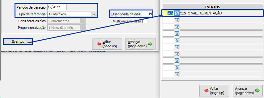 , gera o custo de vale alimentação a partir do movimento já gravado. O evento informativo, precisará estar vinculado no cadastro da empresa, FPA 1.2-A, botão [Eventos Automáticos] e o evento do desconto do convênio, precisa ter o tipo de processamento em quantidade.