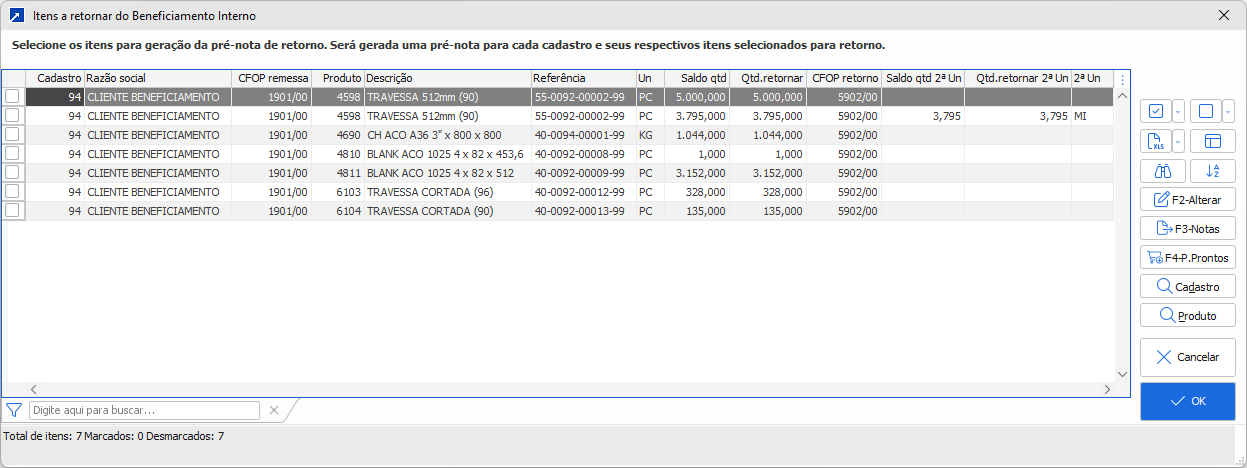 Na manutenção consolidada ou nos menus FAT 2.9-G ou FAT 2.B-G, a geração da pré-nota para retorno é feita a partir da seleção padrão de itens das notas de beneficiamento/remessa/retorno. Após configurar os filtros desejados e confirmar a seleção, será aceita a janela de seleção dos itens a retornar (mesma janela acima).