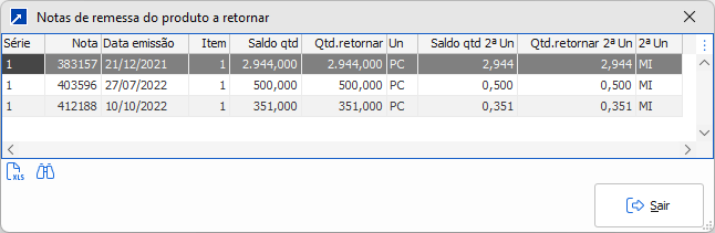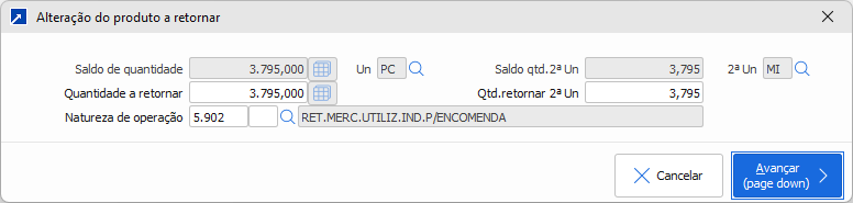 Obs.: A quantidade a retornar na 2ª unidade de medida é aceita somente para os itens que possuem 2ª unidade na nota de remessa.