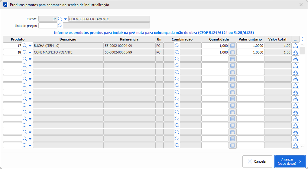 Aceita a lista de produtos prontos retornados/produzidos para a cobrança do serviço de industrialização. A lista de produtos é aceita para cada cliente das notas de remessa selecionadas. Esses produtos serão incluídos na pré-nota com CFOP 5124/6124 ou 5125/6125, de acordo com a CFOP dos itens das notas de remessa selecionadas.