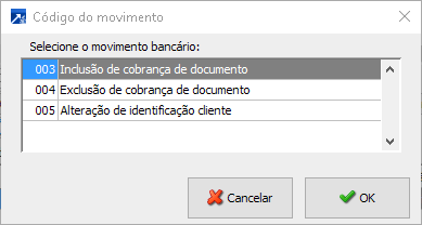 Selecione o código do movimento bancário desejado e acione o botão [OK] .