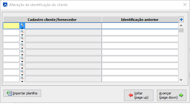 Através dessa opção é possível realizar a alteração da identificação do cliente no banco. Uma janela será aceita com uma janela com um grid, onde será possível indicar os clientes e suas respectivas identificações anteriores para que sejam feitas as suas alterações.