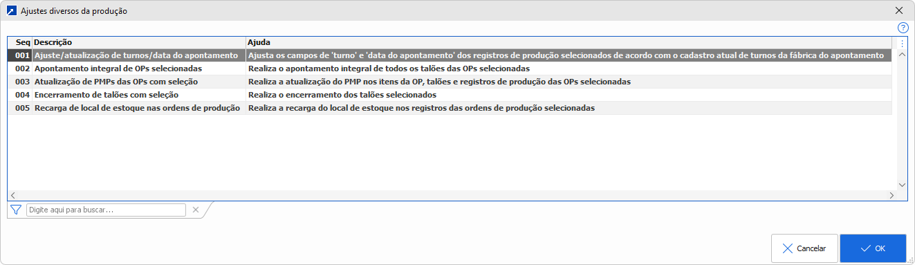 Esse ajuste irá aceitar uma seleção de Ordens de Produção ajustadas. Para cada registro processado, irá ajustar os registros referentes à OP: