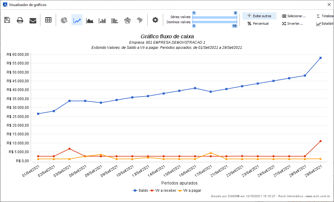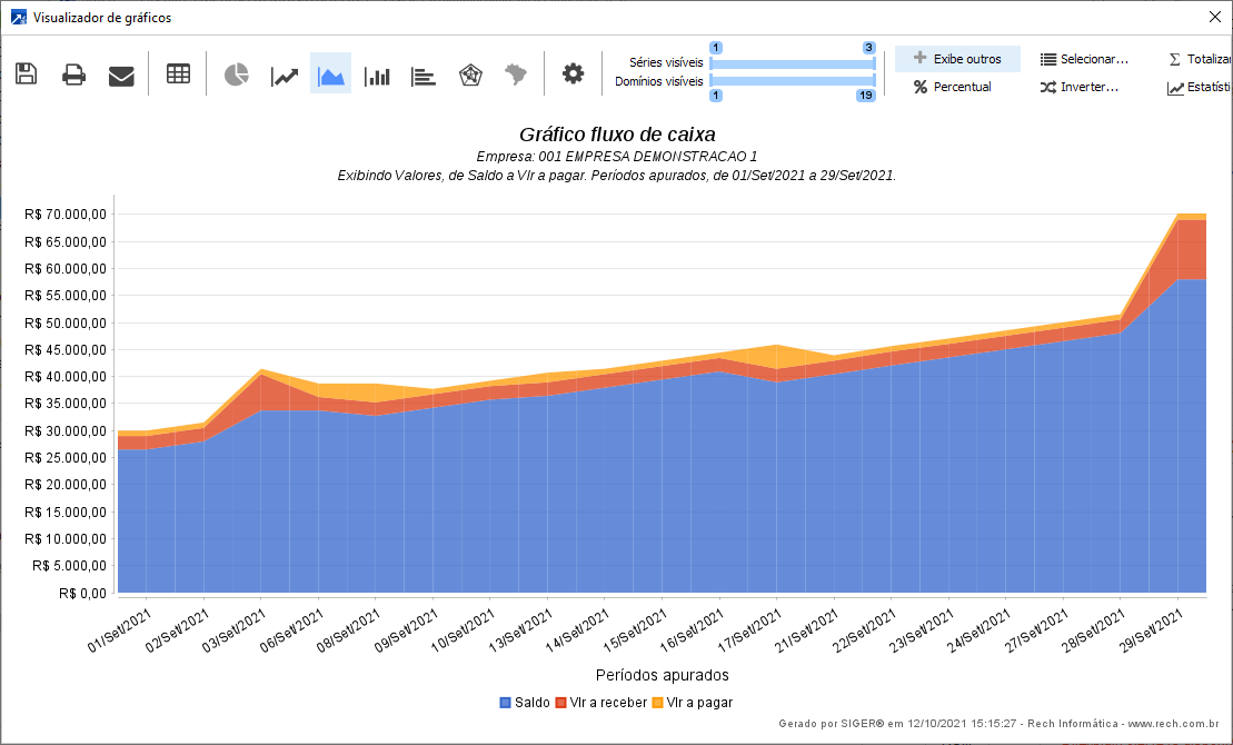 A emissão do gráfico é realizada no menu FIN 4.1-G (Gráfico do Fluxo de Caixa) e segue os mesmos padrões do relatório FIN 4.1-L , sendo que, os campos de agrupamentos, ordenação e totalizações são desabilitados porque não se aplicam ao formato gráfico. Outra diferença é na seleção padrão dos documentos do financeiro, onde os campos de datas são desabilitados.
