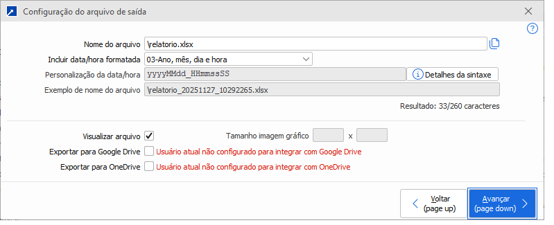 Permite configurar o nome do arquivo de saída caso o formato não seja Gráfico.