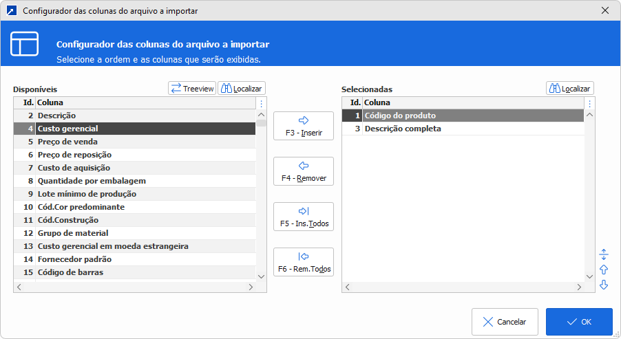 No botão [Configurar colunas] selecione o código do produto, para que possa servir com identificação (quando for alteração de cadastros) e os dados que deseja alterar.