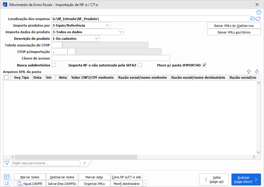 A importação pode ser feita pelo módulo de Livros Fiscais, Estoque ou Compras, mas sempre é necessário que o módulo de Livros Fiscais esteja liberado para que o Estoque ou Compras aceitem importar notas de saída.