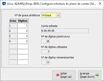 Antes de importar o plano de contas deve ser configurada a estrutura do plano de contas conforme o padrão do Sistema anterior ou do plano utilizado pelo Escritório Contábil, essa configuração está disponível no menu CTB 1.2-A botões <Plano de contas> e <config.do plano>, conforme exemplo na imagem a seguir.
