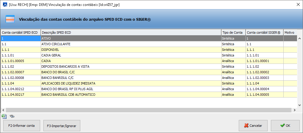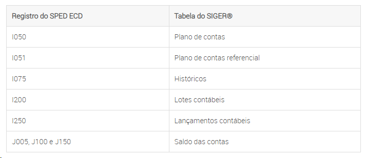 Relação entre arquivo SPED ECD e tabela do SIGER®