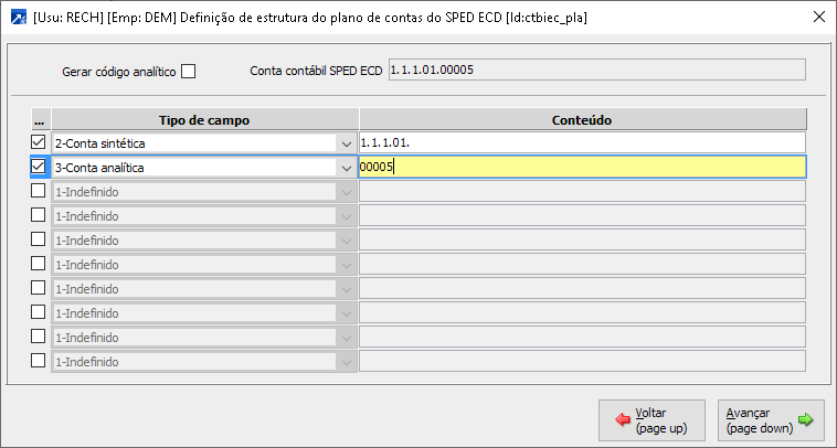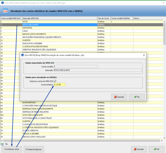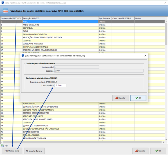 No processo de importação deverá ser feita a definição das estrutura sintética e analítica de contas em relação as informações contantes no plano de contas do arquivo, exemplo abaixo: