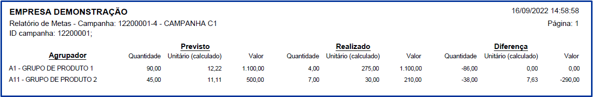 Após o cadastramento de campanhas e metas de venda é possível visualizar todas as informações na forma de um relatório impresso. O modelo utilizado para impressão de metas permite configuração, possibilitando que o relatório seja formatado como for desejado. A impressão das metas de venda está disponível no menu FAT 4.D-J.
