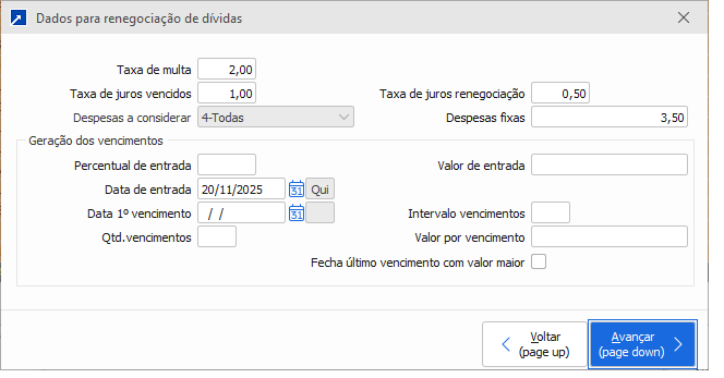 Percentual de entrada: Informar o percentual de entrada da renegociação, caso tenha negociado/combinado com o Cliente/Fornecedor, este campo não é obrigatório.