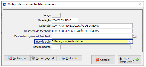 Incluir na Tabela Genérica 28-Tipo de movimento do Telemarketing o movimento específico para rotina de Renegociação de Dívidas, com o Tipo de ação 5-Renegociação de dívidas.