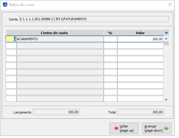 Permite o acesso à janela para rateio de centros de custo, quando aplicável à conta contábil informada.