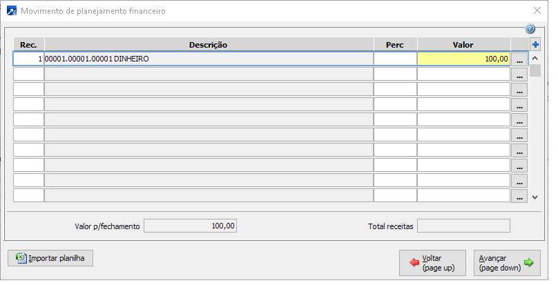 Aceita a janela de planejamento financeiro caso os parâmetros da empresa indiquem que a mesma faz planejamento financeiro e aceita planejamento financeiro para o movimento de caixa/conta corrente.