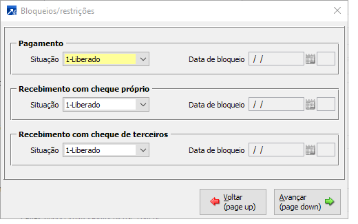 Neste botão não definidos os bloqueios e restrições para o cadastro, essas configurações são aplicados para rotina de controle de cheques e de pagamentos .