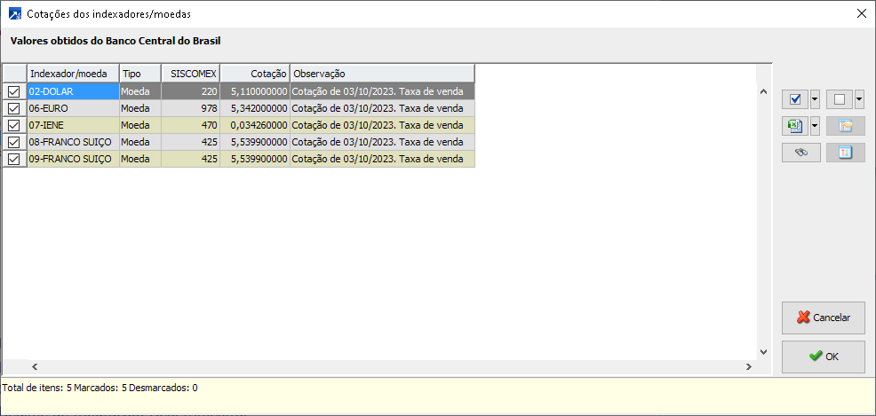 A inclusão da cotação do indexador ou moeda por ser manual ou atualizando via internet clicando no botão [Atualiza via internet], para atualizar via internet requer as devidas configurações, para maiores informações acesse o link .