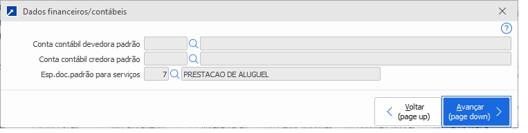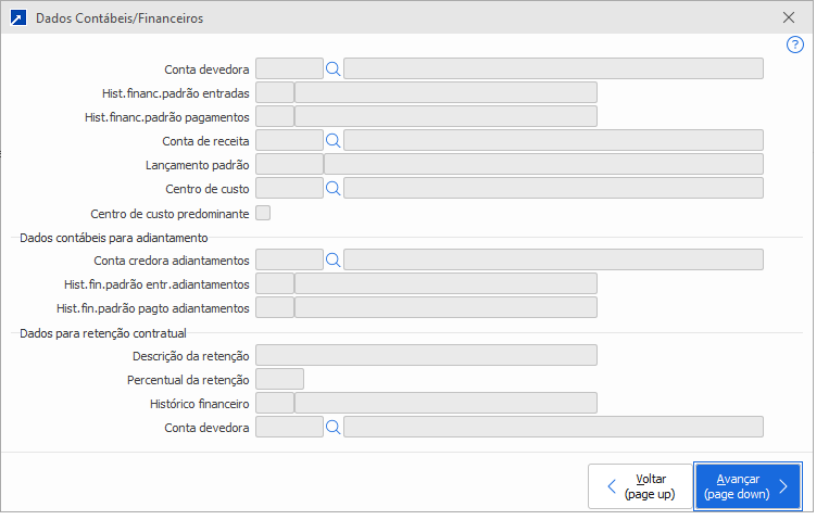 Para alterar as contas do cadastro, acesse a manutenção do cadastro. No botão "Financeiros", em "Dados Contábeis/Fin", é possível informar a conta credora e a conta devedora.