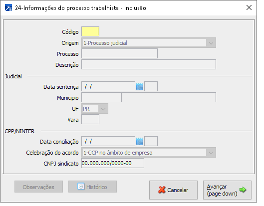 Cadastrar todos os processos trabalhistas que forem sentenciados os pagamentos ou acordos pela Justiça no trabalho, CCP (Comissão de Conciliação Prévia) ou Ninter (Núcleos Intersindicais). MENU FPA 1.3-M tabela 24 botão [Incluir] ou botão [Alterar].