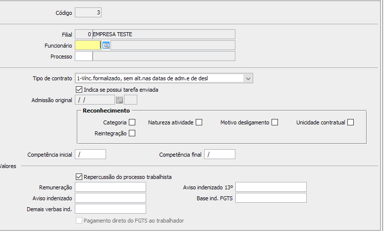 Após o cadastramento do processo é necessários incluir os dados do processo, valores a recolher, incidências e indenização para o funcionário no MENU FPA 2.E-M, botão [Incluir]. Informar os dados do processo do funcionário, de acordo com a sentença do JUIZ. Cada tipo de processo, vai gerar tarefas para ser enviado ao eSocial em eventos específicos.