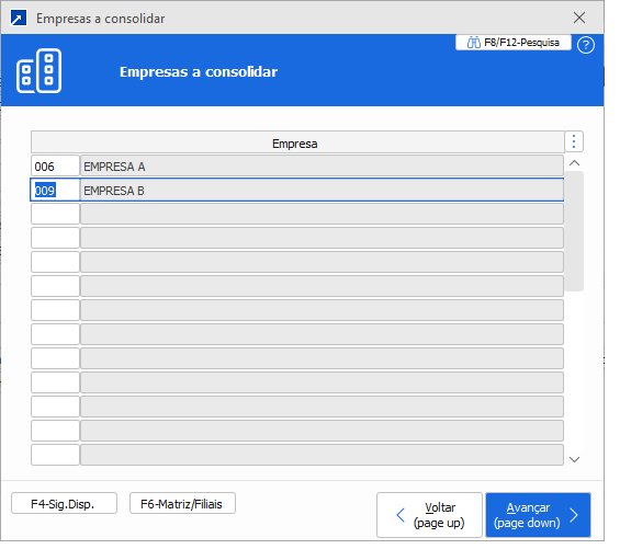 2. Empresas a consolidar: Nesta opção, o sistema utiliza a configuração do menu 1.2-A – Manutenção de Empresas-Alteração, onde cada empresa pode informar uma lista de outras siglas para consolidar informações para consulta de posição financeira.