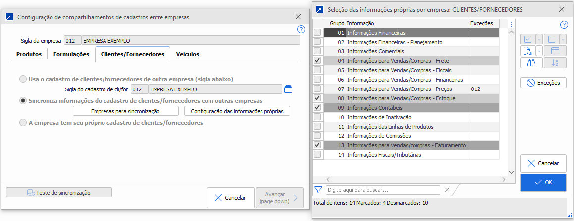Quando o sistema está configurado para considerar empresas que compartilham informações comerciais, o comportamento é sempre o mesmo: