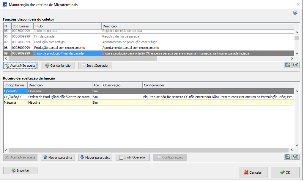 'Sugere máquina talão': Se estiver configurado como 'Sim' e caso for aceito na função, irá preencher automaticamente o campo de máquina com a primeira máquina programada do talão.
