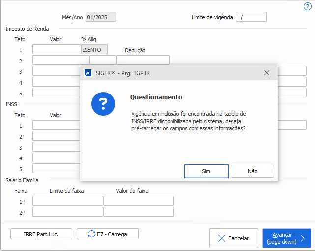 MENU FPA 1.3-M, tabela 01, botão [Incluir] [Consultar], ao clicar no botão [Incluir] e informar nova vigência, SIGER® vai mostrar mensagem dizendo que foi encontrada uma tabela de INSS/IRRF disponibilizada pelo sistema com opção de pré-carregada. Ao clincar no botão [Sim], SIGER® vai carregar a tabela da vigência informada.
