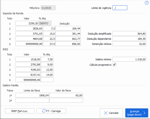 Exemplo da tabela pré carregada na vigência JANEIRO/2025, SIGER® atualizou os valores de INSS, novo salário mínimo e o salário família.