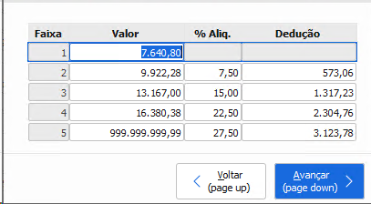 No botão [IRRF Part.Luc], será pré carregada a tabela de IRRF exclusiva para ser aplicado no calculo da Participação nos lucros e Resultados, conforme dados da Receita Federal. Por meio da Instrução Normativa RFB 2.174/2024 foram alteradas as tabelas progressivas – Imposto sobre a Renda das Pessoas Físicas, para os fatos geradores ocorridos a partir de fevereiro/2024.