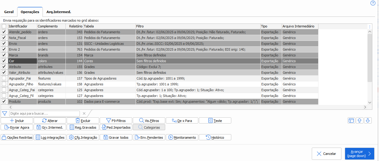 Os envios de informações permitem filtros, conforme cada uma das seleções padrões das tabelas do gerador de relatório utilizada. Ex: no envio de produtos é possível filtrar apenas determinado grupo de produtos.