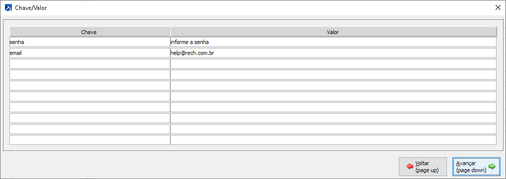 Chave/Valor Informar neste botão o usuário e senha, conforme enviados pela Deps, seguindo o exemplo na imagem a seguir. Importante: As literais da chave devem ser escritas exatamento como neste exemplo, "senha" e "email".