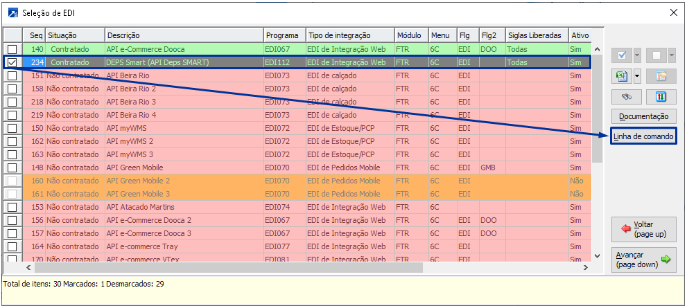 A linha de comando para configuração da tarefa está disponível no menu FTR 6.C-M, selecione o EDI "234-DEPS Smart (API Deps SMART)" e selecione o botão <Linha de comando>, conforme exemplificado na imagem a seguir.
