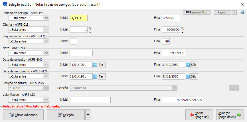 Ao acessar o menu será exibida a "Seleção padrão - Notas fiscais de serviços" para selecionar os movimentos a integrar no financeiro.