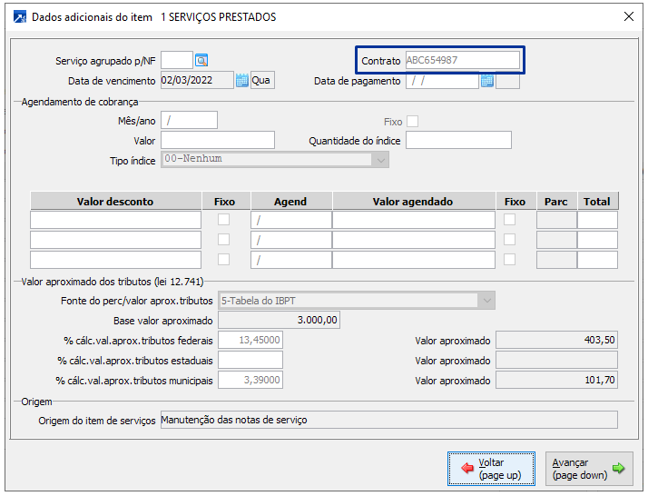 Obs.: A informação do contrato está disponível no campo "Contrato" no botão <...> dados adicionais do item do serviço, conforme demonstrado na imagem a seguir.