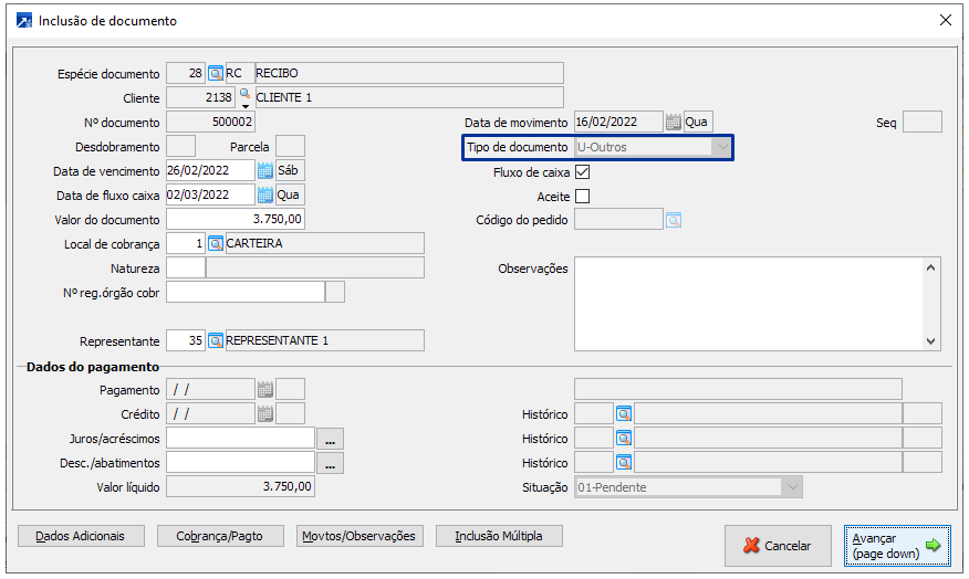 1-Outros: Tipo de documento "U-Outros" a ser gerado para recibos faturados, esse tipo de documento possibilita a integração na contabilidade, caso possua o módulo contabilidade contratado. Na imagem a seguir é demonstrado como identificar o tipo do documento financeiro.