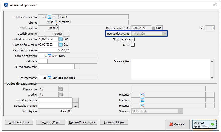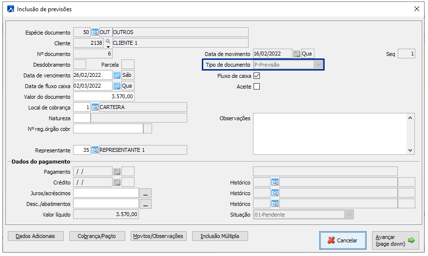 2-Previsão: Tipo de documento "P-Previsão" a ser gerado para demonstrativos faturados, esse tipo de documento não possibilita a integração na contabilidade. Na imagem a seguir é demonstrado como identificar o tipo do documento financeiro.