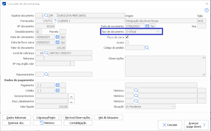 3-Oficial: Tipo de documento "O-Oficial" a ser gerado para recibos faturados, esse tipo de documento possibilita a integração na contabilidade. Na imagem a seguir é demonstrado como identificar o tipo do documento financeiro.