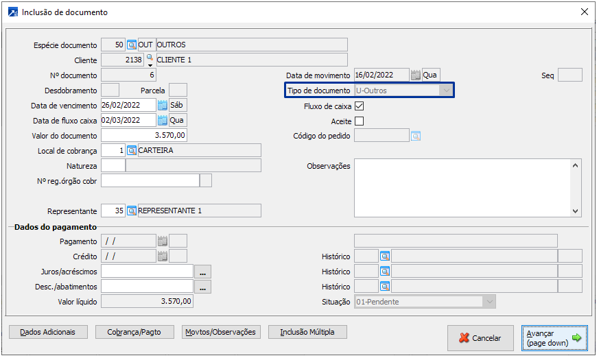 1-Outros: Tipo de documento "U-Outros" a ser gerado para demonstrativos faturados, esse tipo de documento possibilita a integração na contabilidade, caso possua o módulo contabilidade contratado. Na imagem a seguir é demonstrado como identificar o tipo do documento financeiro.