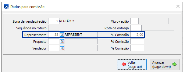 Se marcado, grava comissão no faturamento de notas. O representante e o percentual de comissão serão carregados do cadastro do cliente, conforme informados no botão <Comissão>, conforme demonstrado na imagem a seguir.