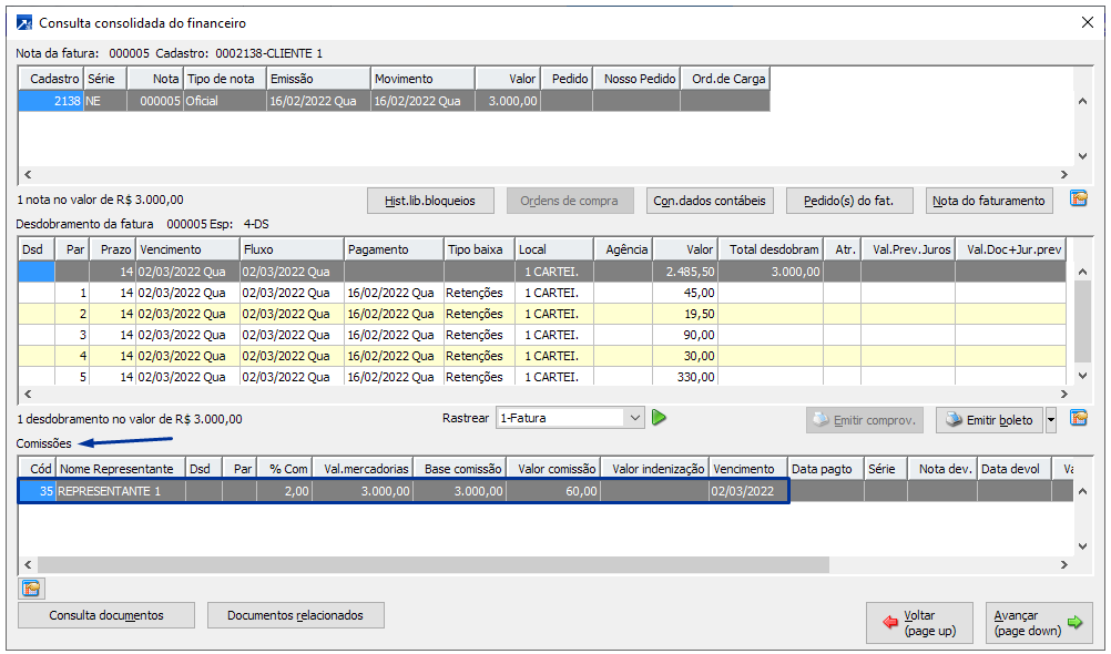 No documento do financeiro, o registro de comissão está disponível na consulta consolidada do documento, conforme exemplo na imagem abaixo.