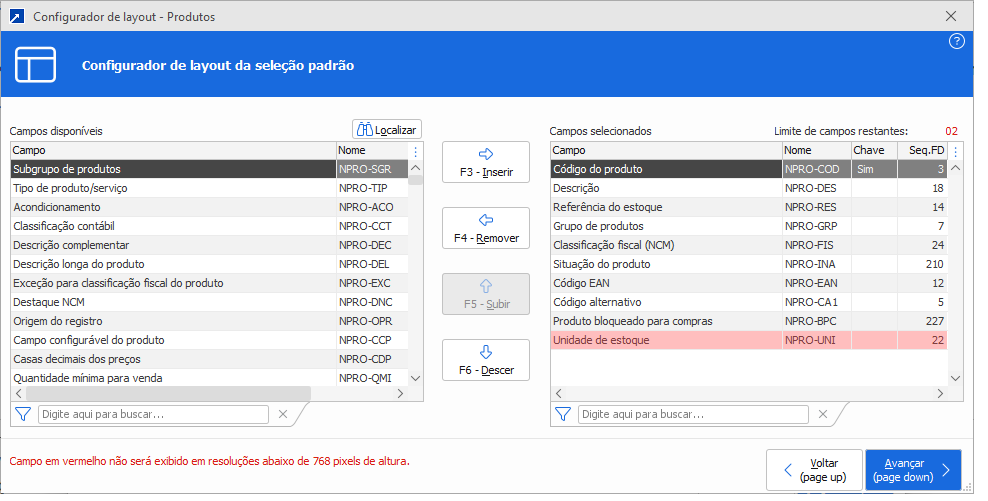 Limite de campos restantes: a quantidade de campos que serão exibidos na tela principal, pode variar pela resolução de vídeo (tamanho do monitor), por esse motivo alguns campos são exibidos em vermelho, alertando essa possível alteração.