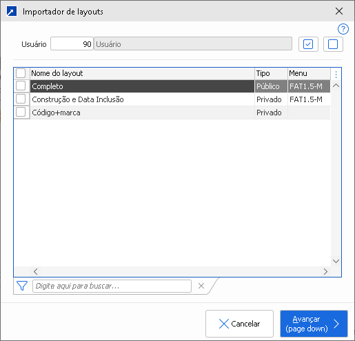 Ao selecionar o usuário, são exibidos todos layouts disponíveis para importação, da tabela em questão.